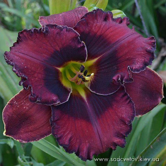 Темний вишневий з чорно-вишневим оком і такою ж гофрованою тонкою каймою, горло - від оранжевого через жовтий до лимонно-зеленого.