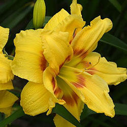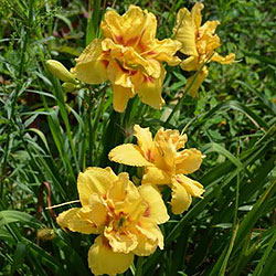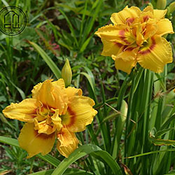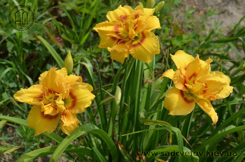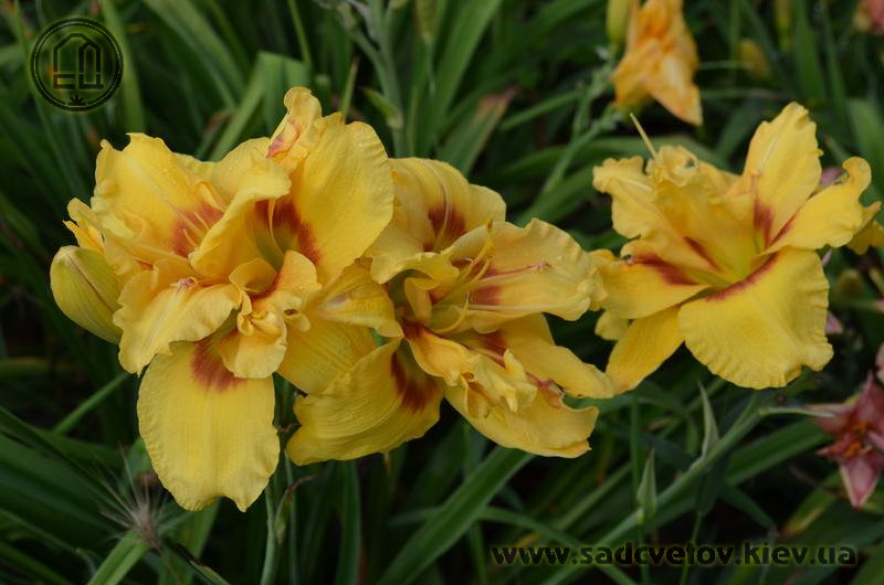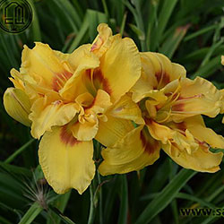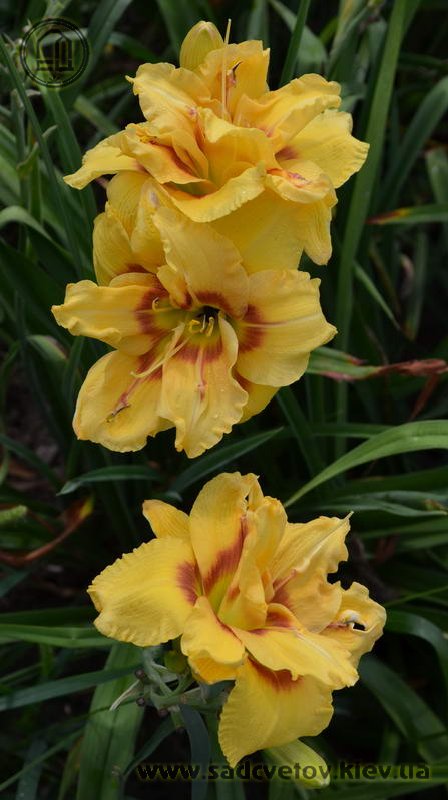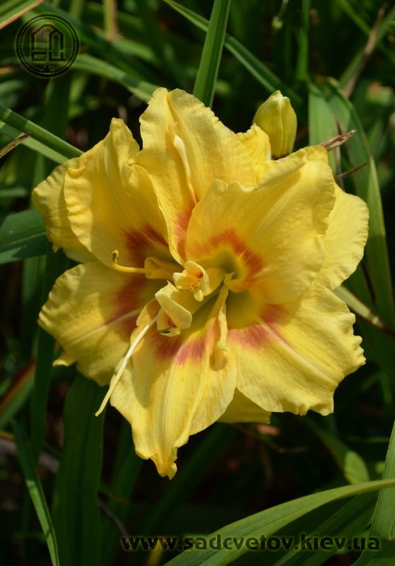 Кремово-жовтий махровий гігант з червоно-коричневим оком і жовто-зеленим горлом.