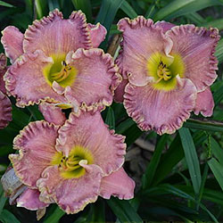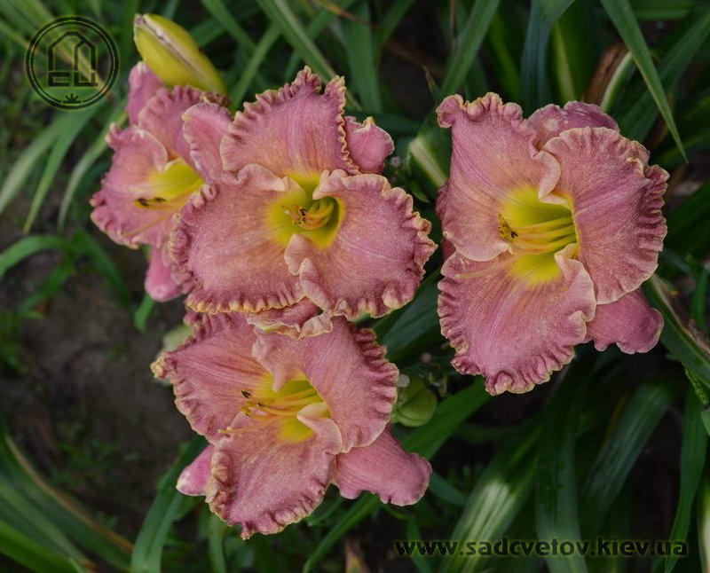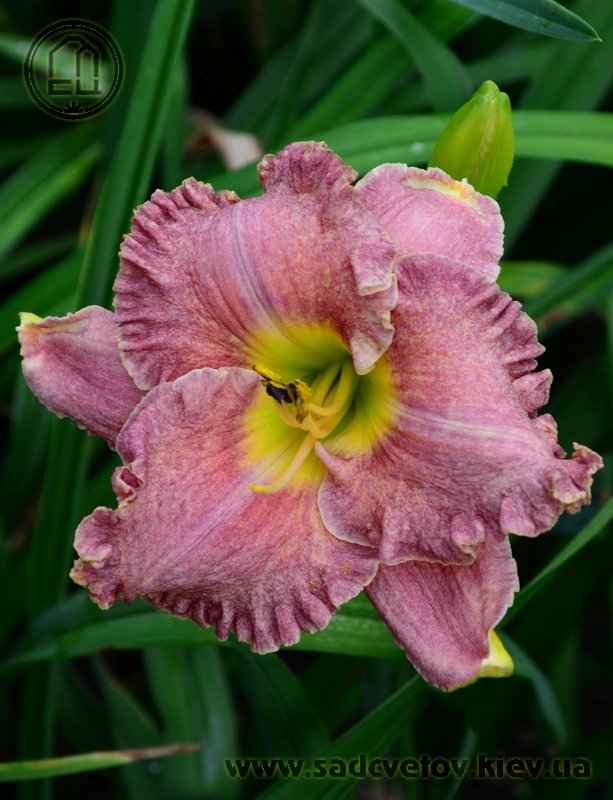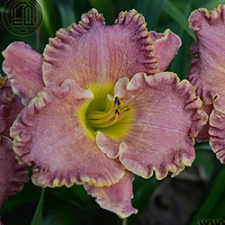 Незвичайний муаровий рожевий з золотистими і сріблястими вкрапленнями з широко гофрованим краєм, лимонно-зелене горло.
