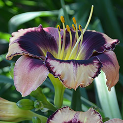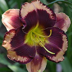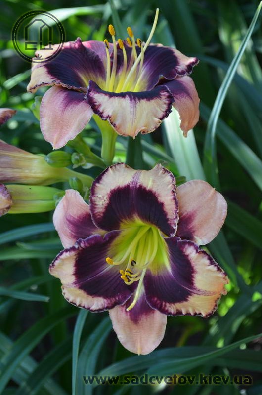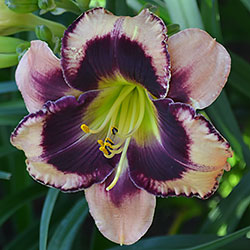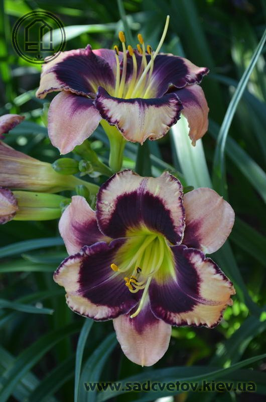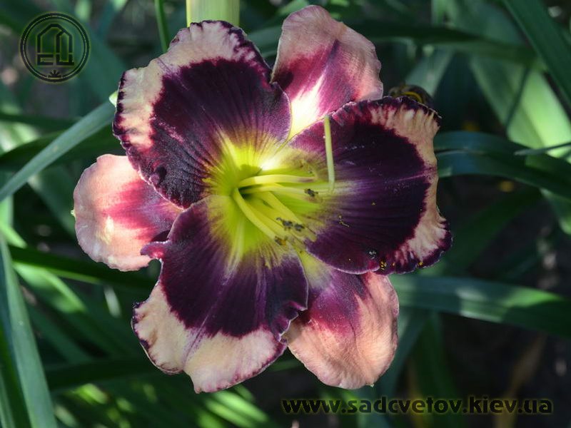 Оранжево-персиковий з дуже великим вишневим оком і такою ж облямівкою, гірчичним з лимонно-зеленим горлом.