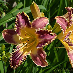 Цегляно-малиновий колір основних трьох пелюсток в поєднанні з блідо-рожевим інших трьох, бордове око розсічене білими променями з великого лимонного горла, лимонна зубчаста облямівка.