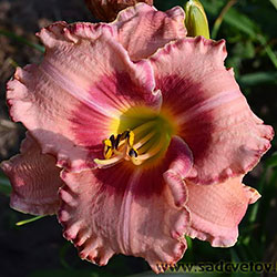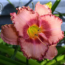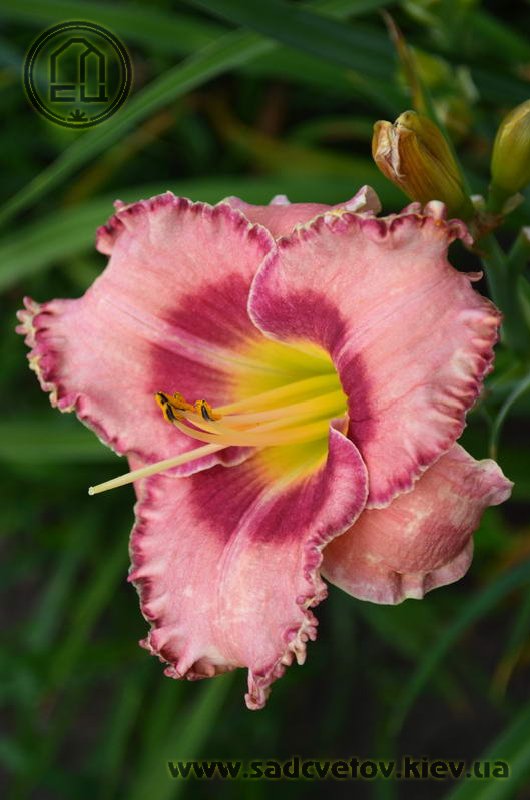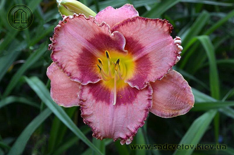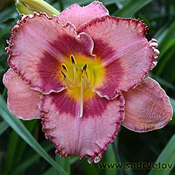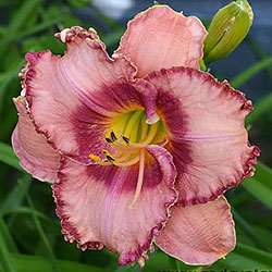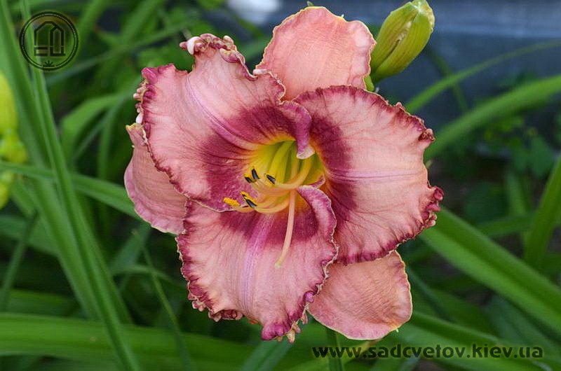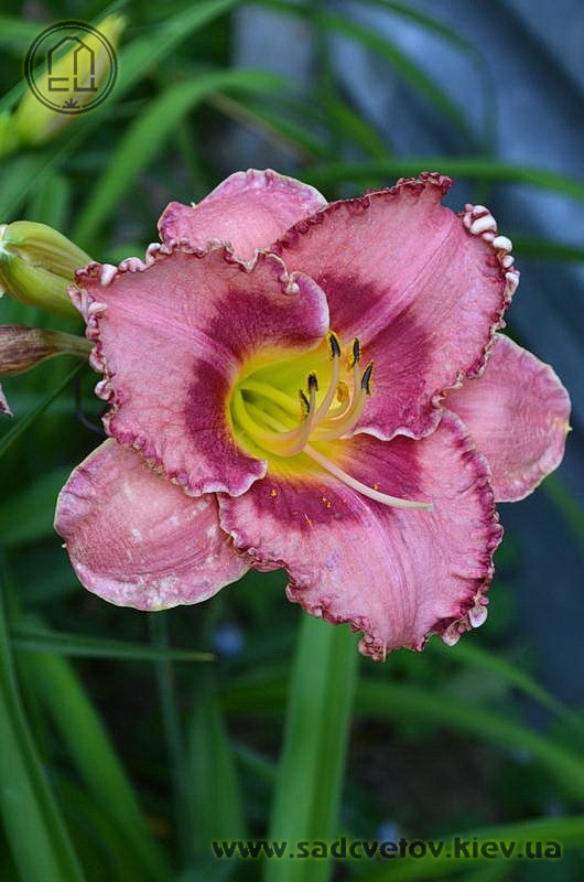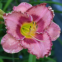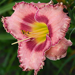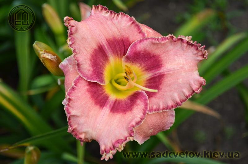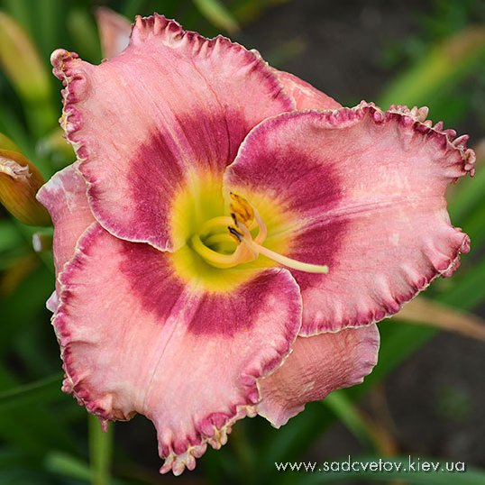 Акуратний гофрований молочно-рожевий з яскравими карміновими оком і тоненькою облямівкою по краю пелюсток, лимонно-зелене горло.