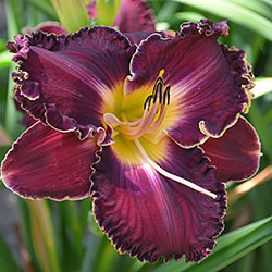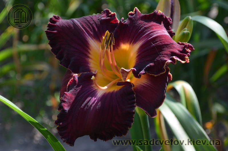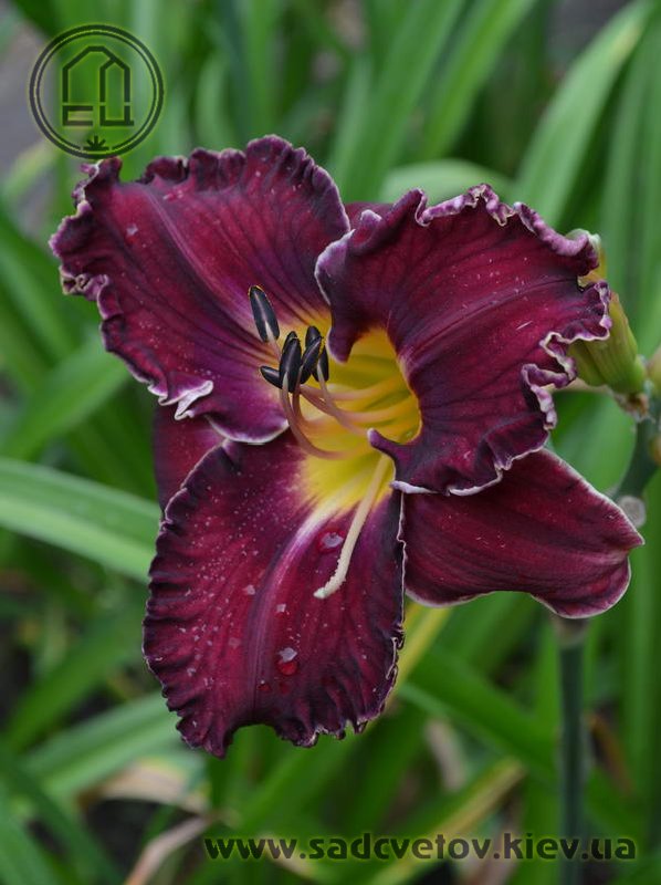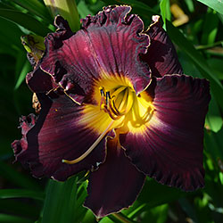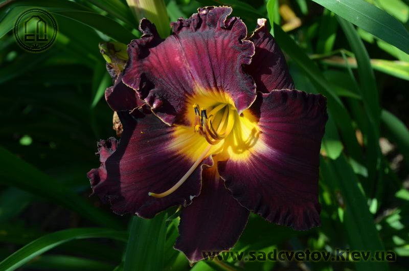 Великий гофрований темно-вишневий з оранжево-жовтим горлом.