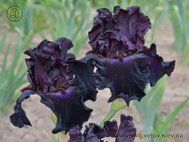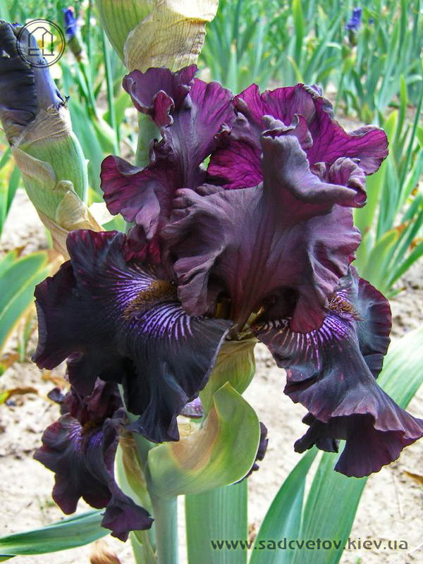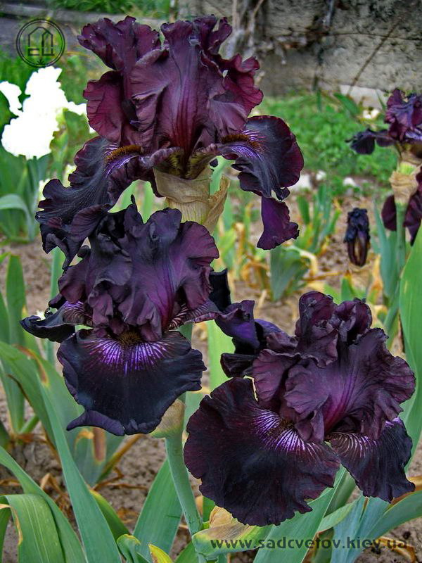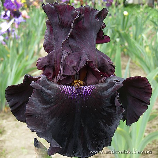 Сильний гофрований вишнево-чорний красень. Ф. темніші з невеликим біло-фіолетовим малюнком у червоно-вохристих б.