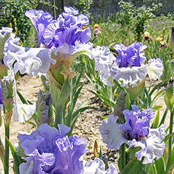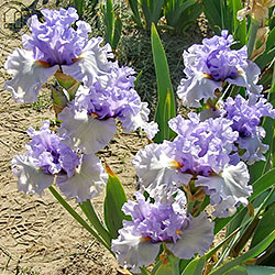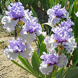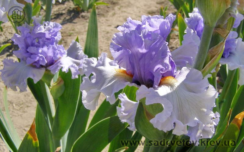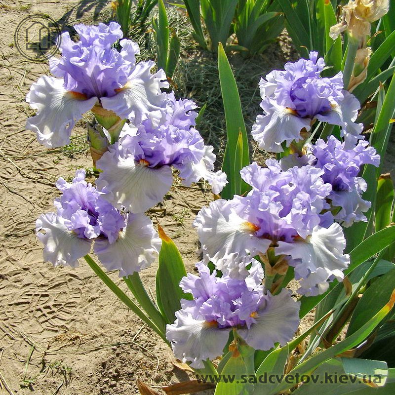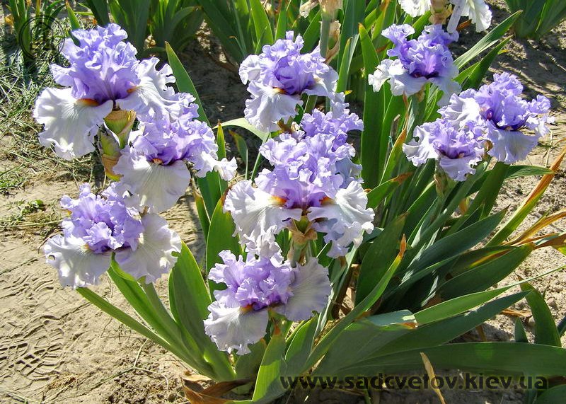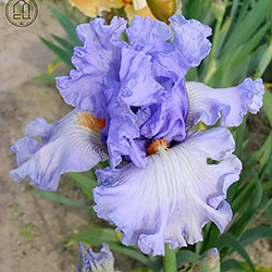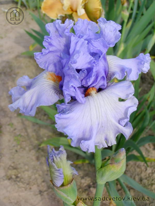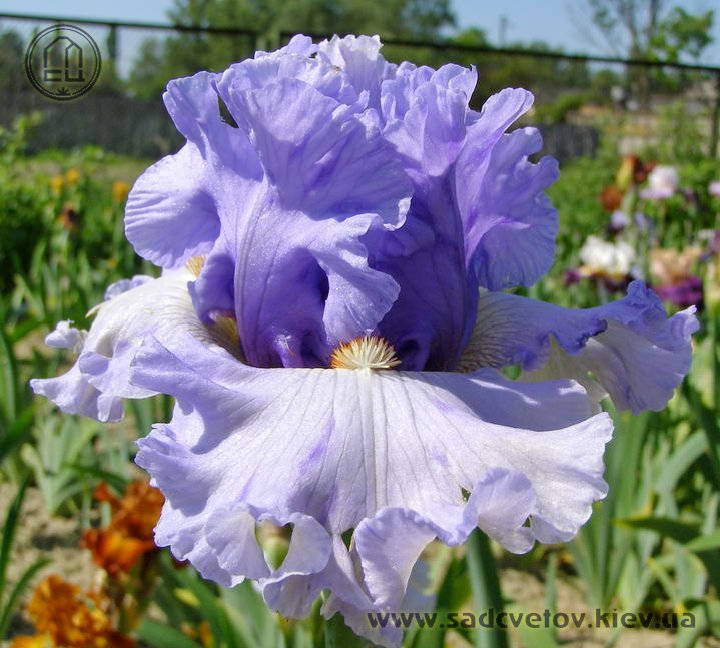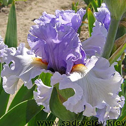 Ефектна супергофрована фіолетово-лавандова квітка реверсивного забарвлення. Ст. темніше - синьо-фіолетові, ф. світліше - лавандові з великим висвітленням навколо помаранчевих б.