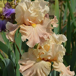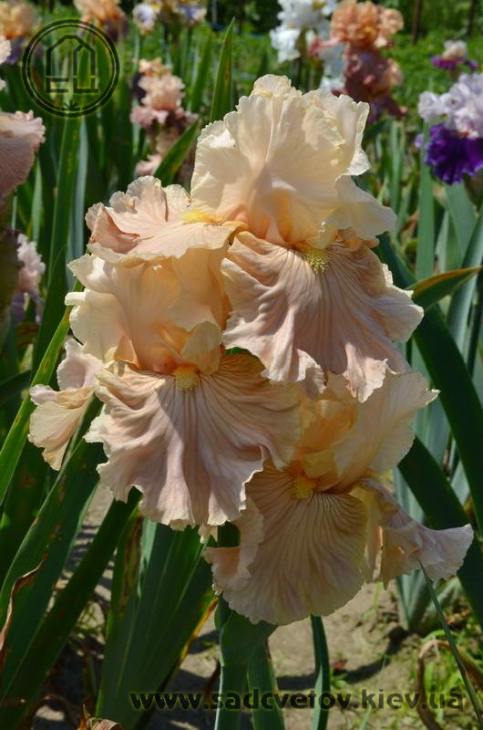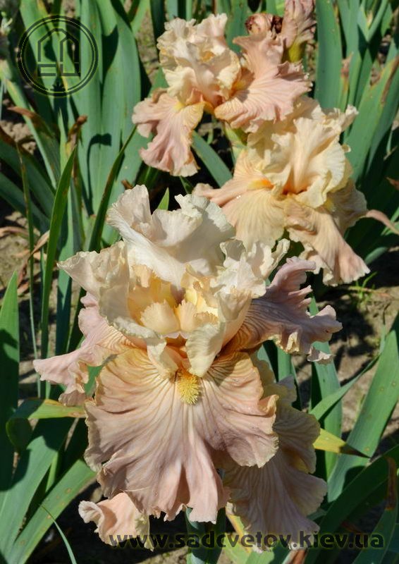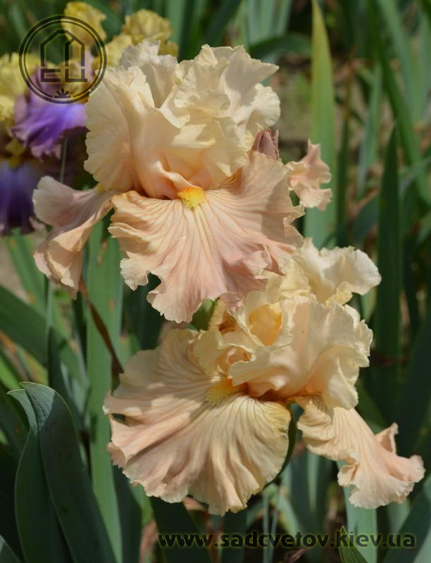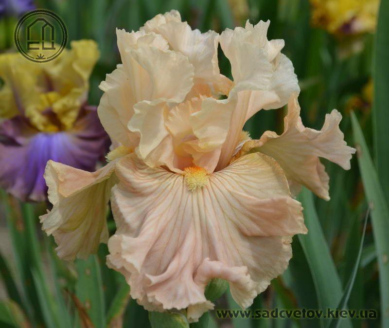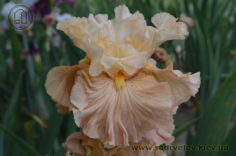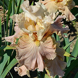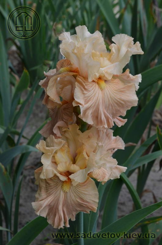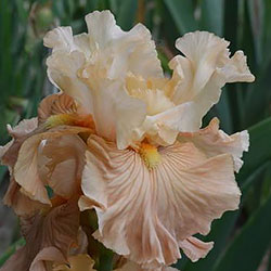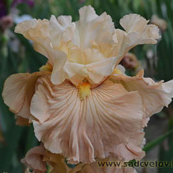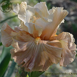 Своєрідно гофрована однотонна квітка. Ст. - жовтувато білі з легким абрикосовим рум'янцем в середніх жилках, ф. - кольору стандартів в основі з віялом блідих оранжево-жовтих прожилок по всій поверхні фол і абрикосового відтінку в плечах, б. - світлий жовтий і помірний оранжевий.