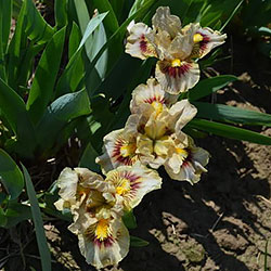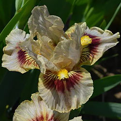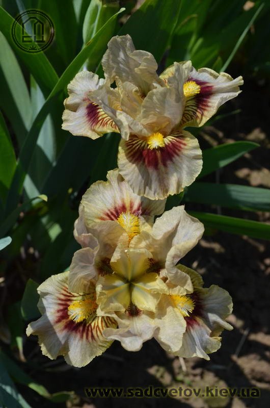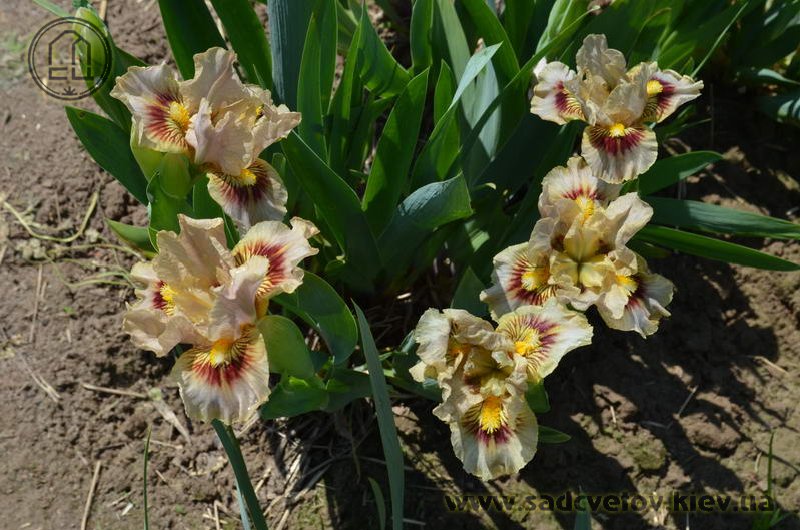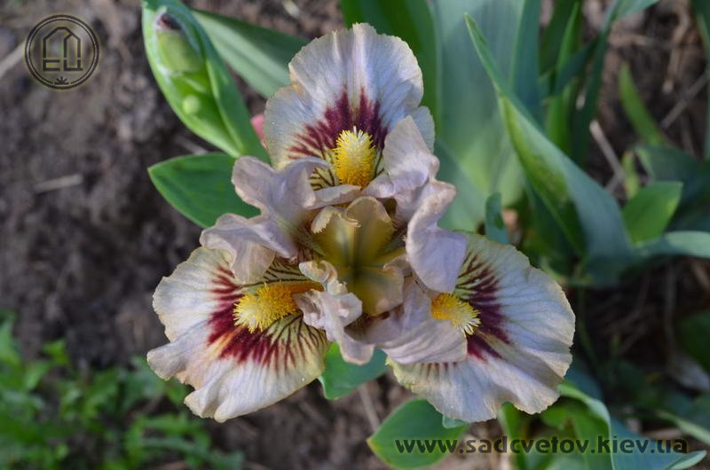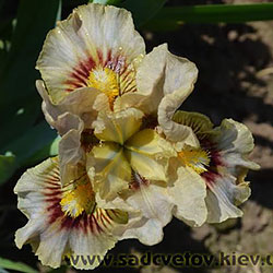 Гофрована квітка. Ст. - дуже світлий зеленувато-лавандовий з помітними темними прожилками, серединка як стандарти з зеленувато-жовтими включеннями, ф. - як стандарти з темною коричнево-бордовою плямою навколо бороди, яка розріджується на прожилки в жовтуватих плечах. Б. - яскравий жовтий з білим в основі, більш вираженим на кінчику.