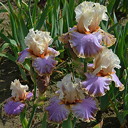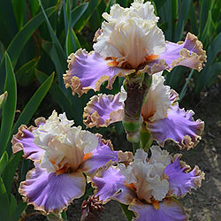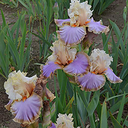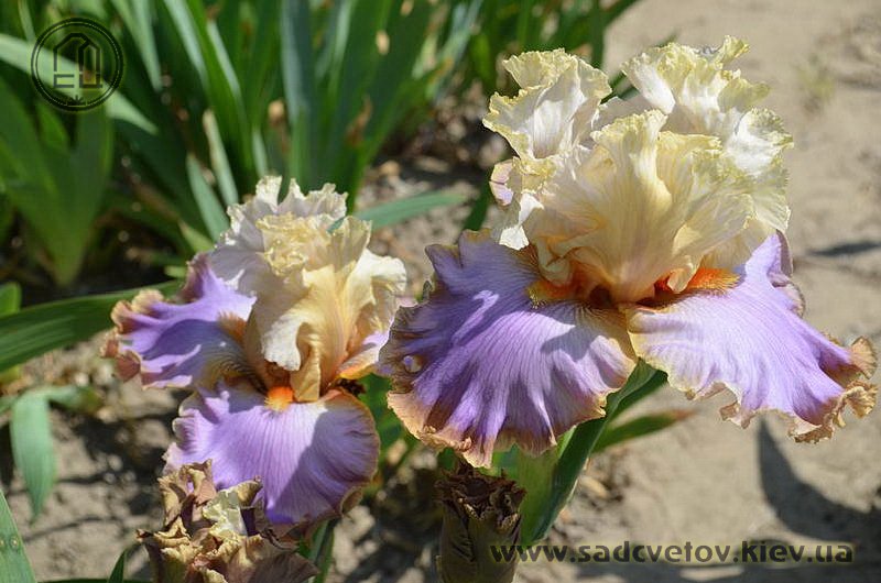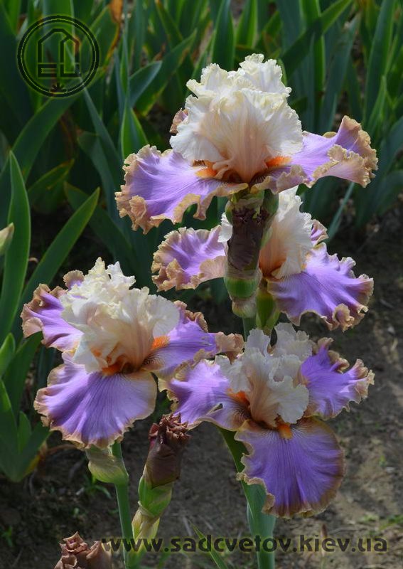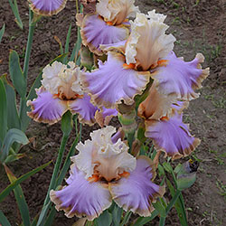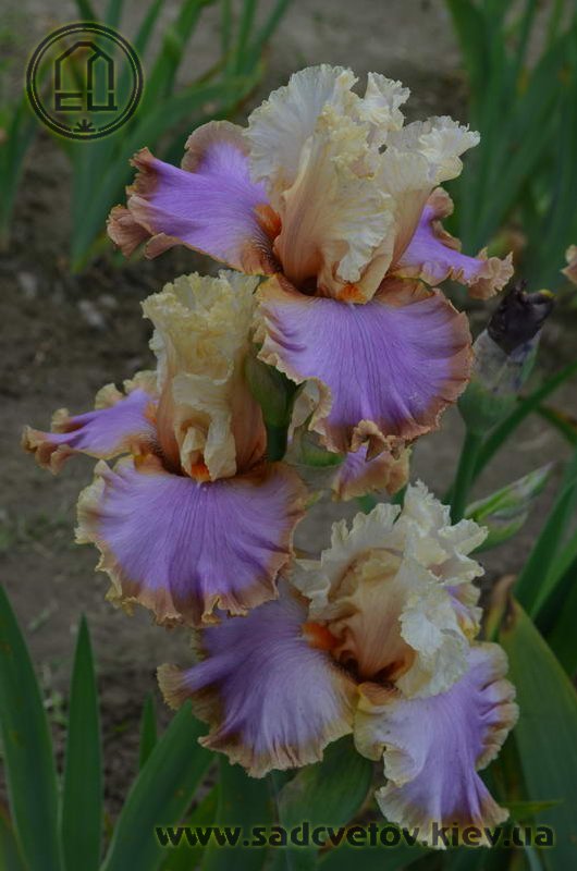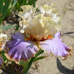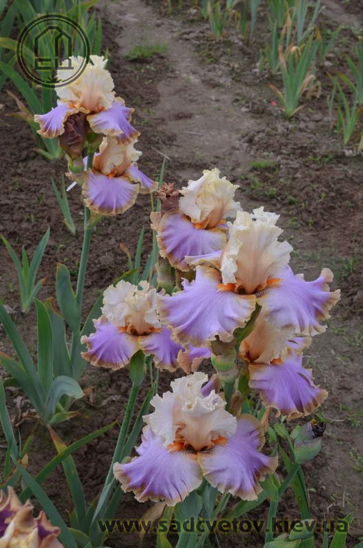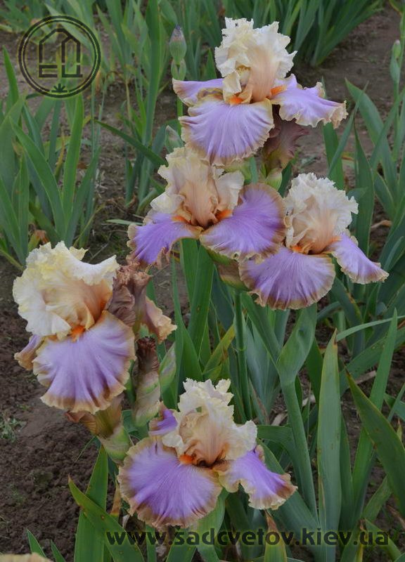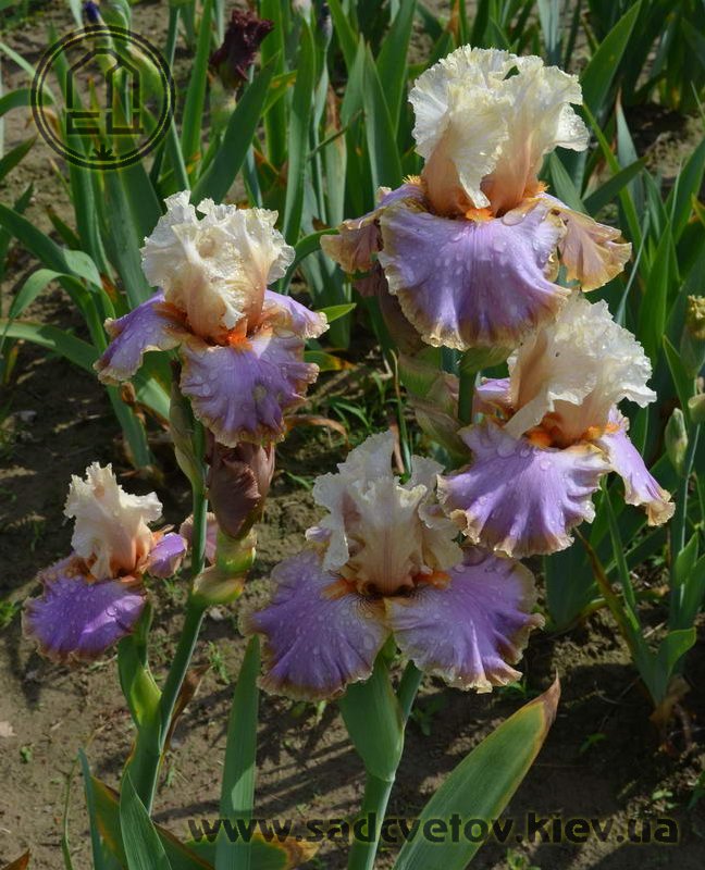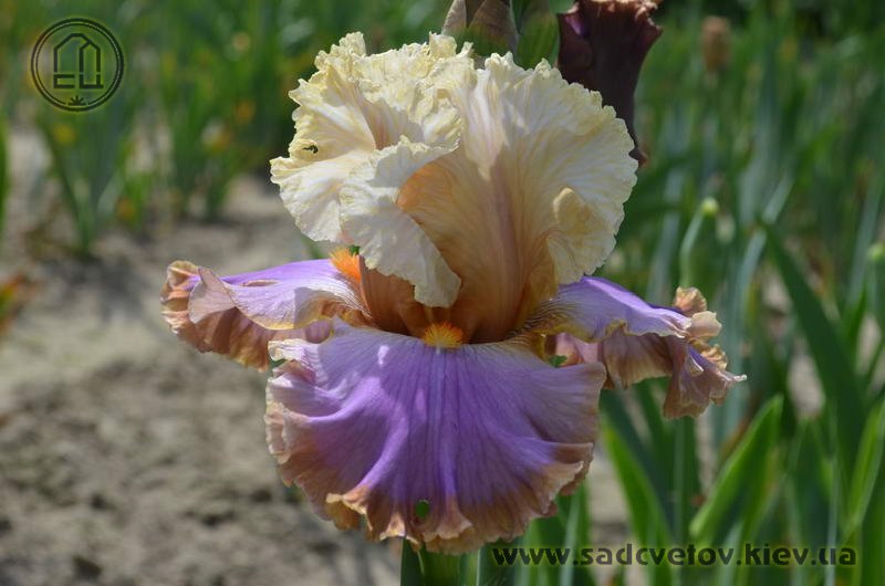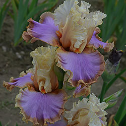 Велика мереживна гофрована квітка. Ст. - по білій основі яскраво виражене віяло золотистих прожилок з лавандовими в стрижні. Ф. - світлолавандові з 1/3" світло-абрикосовою облямівкою і плечима. Б. - приглушені оранжеві і жовті на кінці