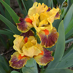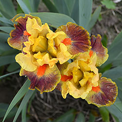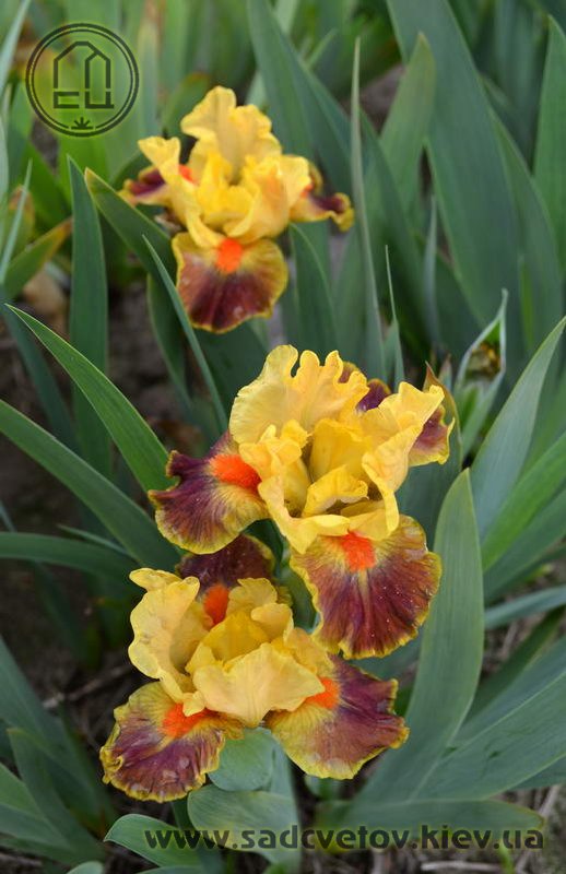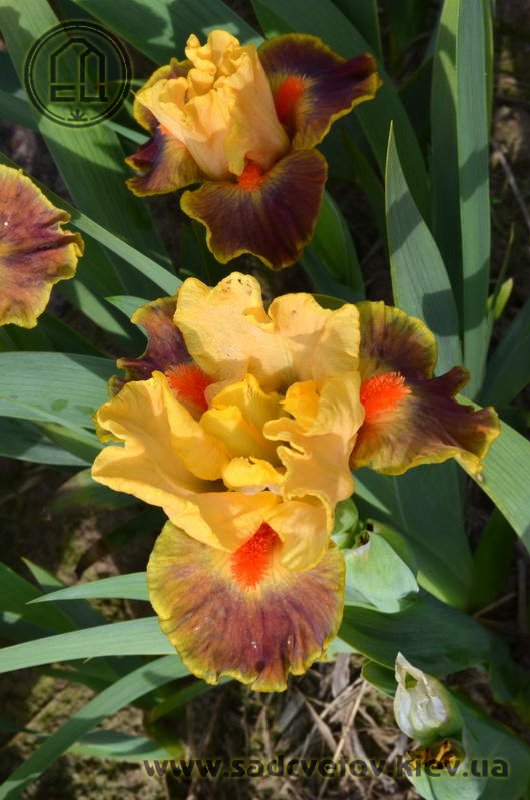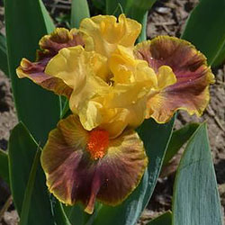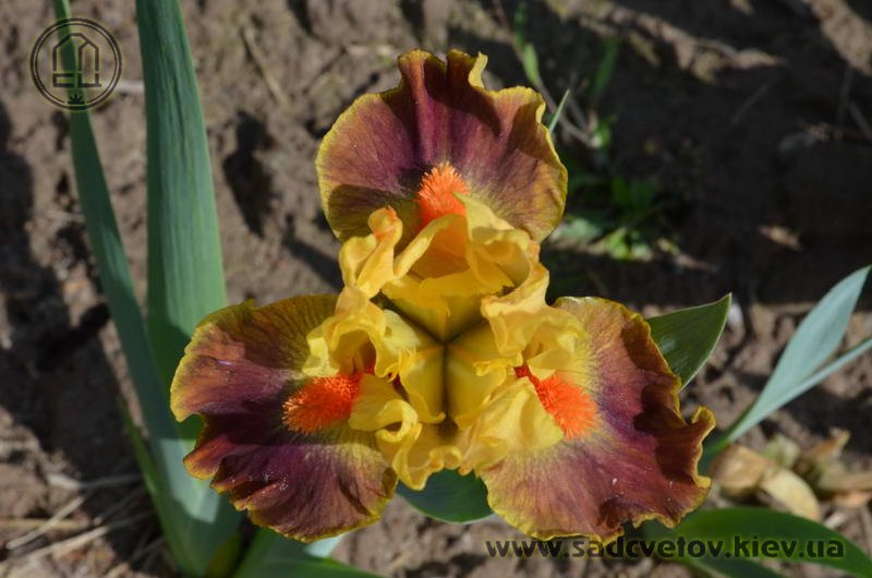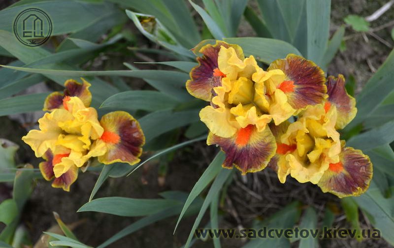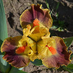 Гофрована квітка. С. - абрикосово-жовті. Серединка - зеленувато-жовта. Ф. - сливово-червоний під бородою який переходить в червоно-коричневий до гірчичних плечей з жовтим круговим висвітленням навколо бороди і тонкою каймою по краю. Б. - яскраві оранжеві.