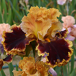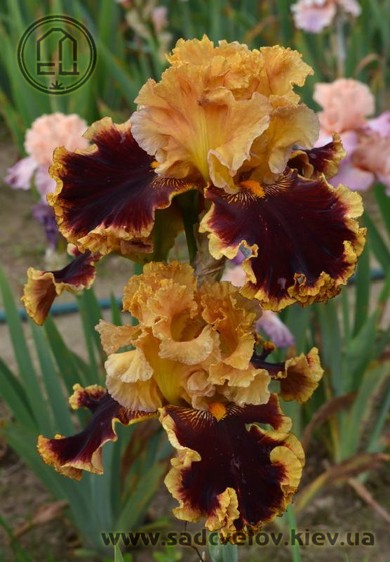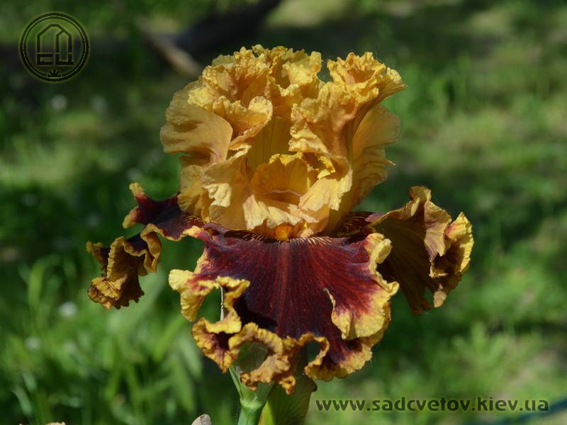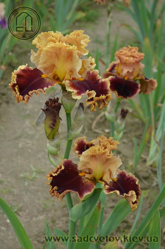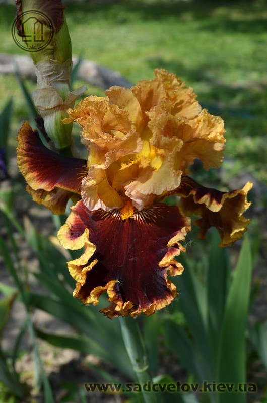Супергофрована, мереживна квітка. Ст. - Світлого золотисто-коричневого кольору з зелено-жовтим стрижнем в срежніх жилках. Серединка мереживна з золотисто-жовтими кінчиками. Ф. - темні бордові, більш червоні з боків з широкою 1/4" світлою золотисто коричневою облямівкою по краю і невеликою люмінатою білих прожилок від бороди і жовтих в плечах. Б. - оранжеві з більш жовтим кінцем.