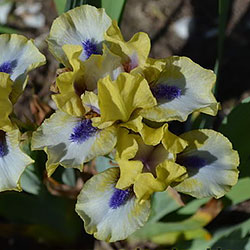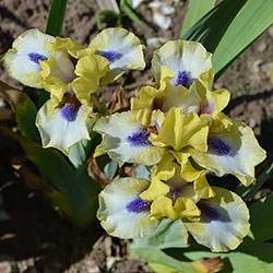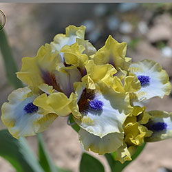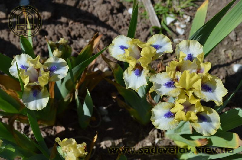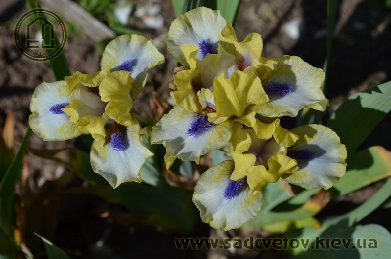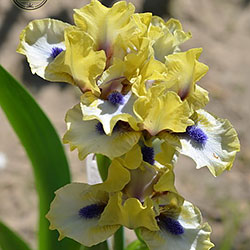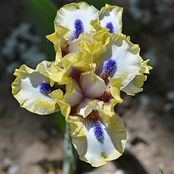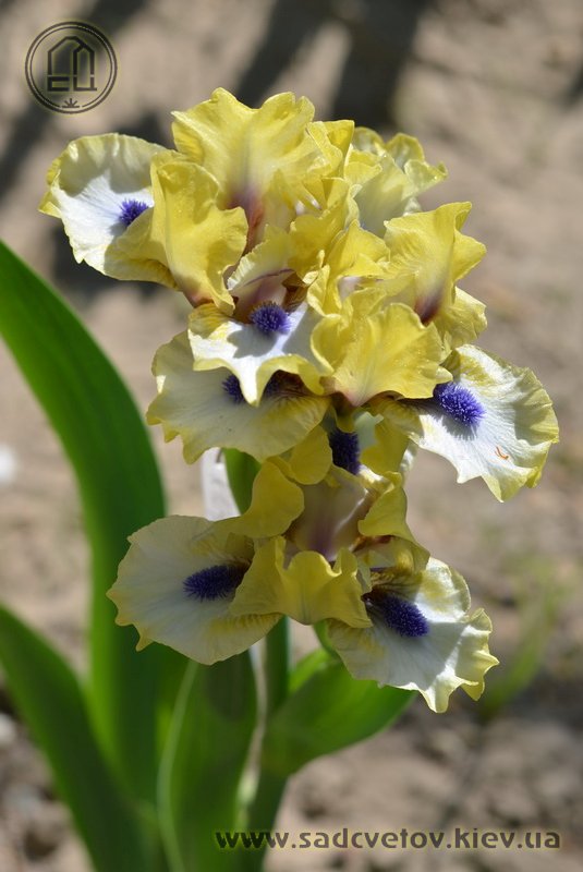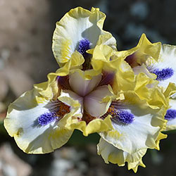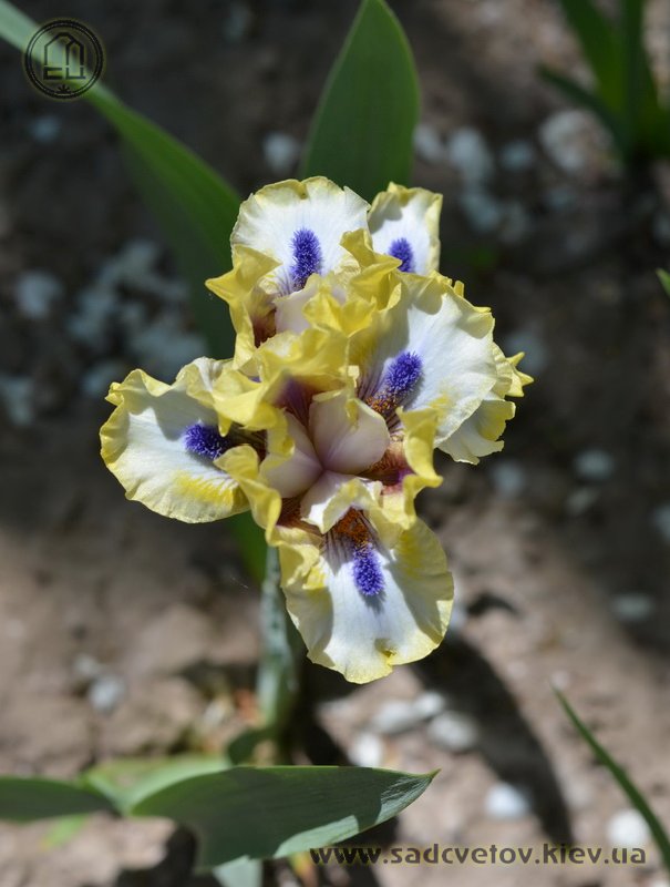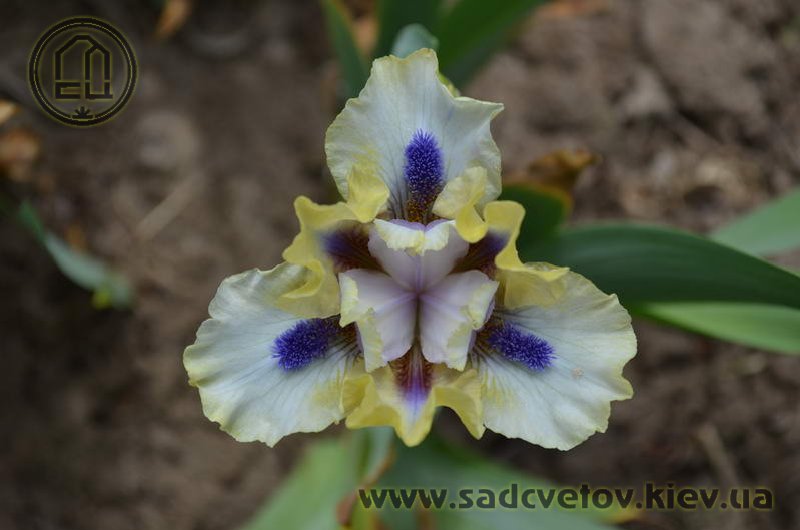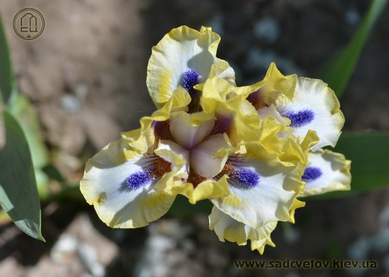 Незвичайний графічний контраст. Лимонно-кремові ст. з темною бордовою основою, сукупно з білими внутрішніми лопатями маточки. На тлі білих з лимонно-кремовими плечима і кремовою облямівкою фол, темні індиго-сині з мандариновим борідки.