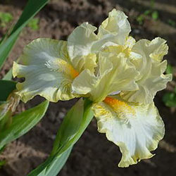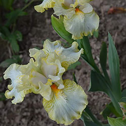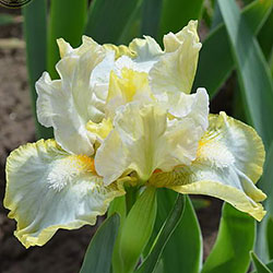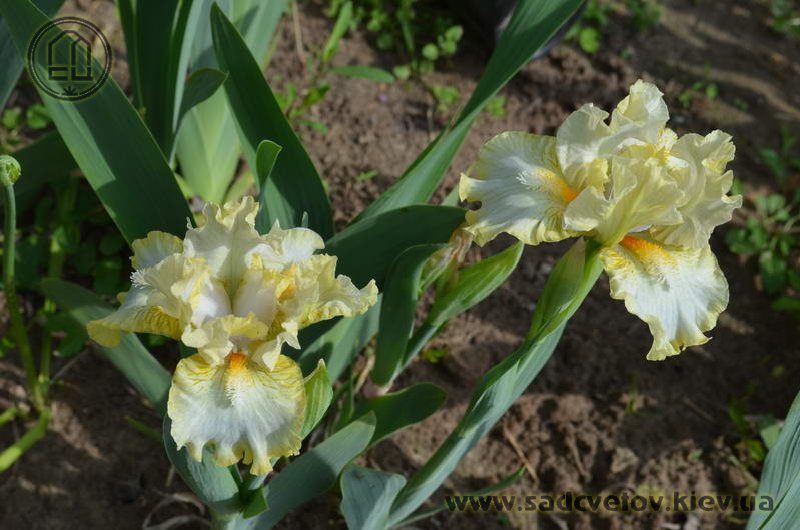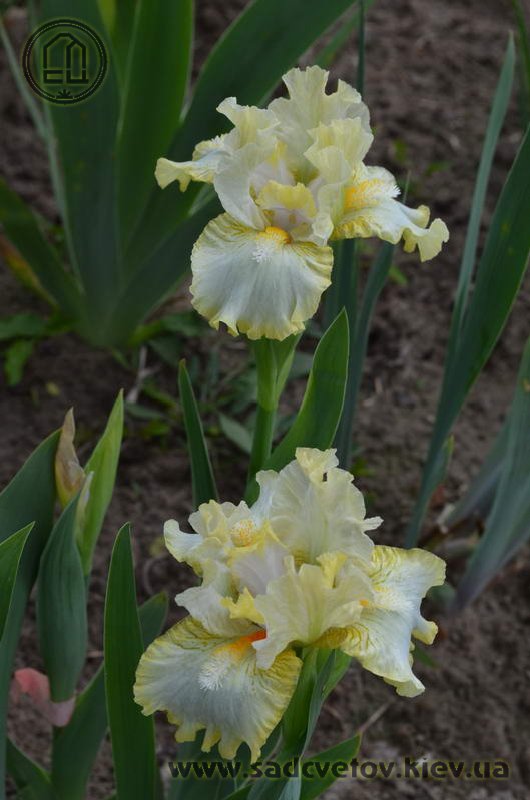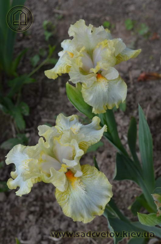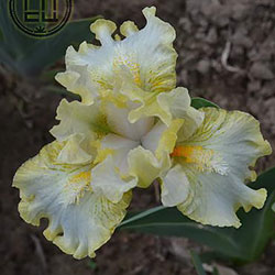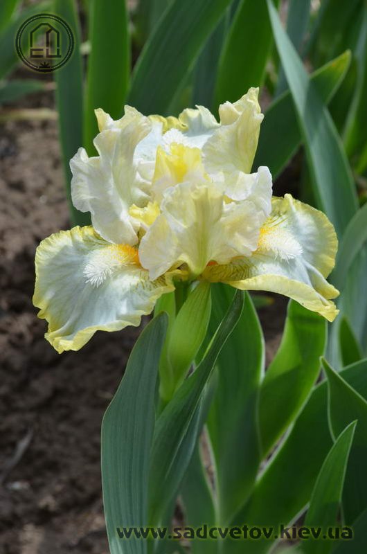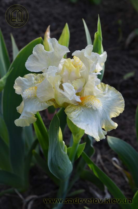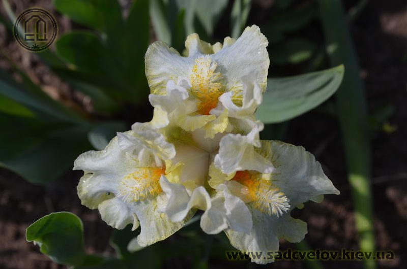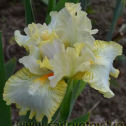 Добре гофрована жовто-біла пліката. Ст. - Білі з зеленувато-жовтим віялом прожилок які розгалужуються від основи. Серединка біла з зеленувато-жовтими кінчиками. Ф. - білий з зеленувато-жовтим візерунком плікати, малопомітним по краю і вираженим в плечах. Б. - від білого на кінці через жовтий в середині до оранжевого в горловині.