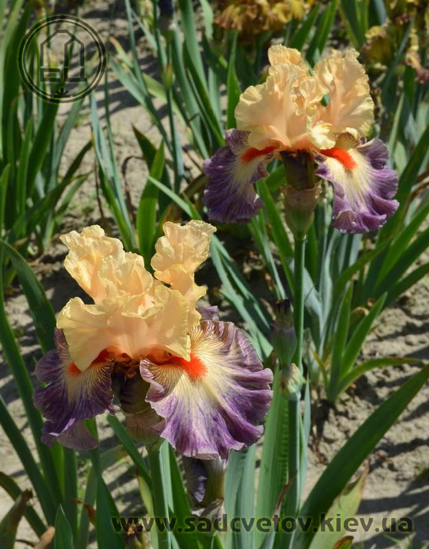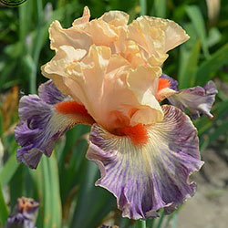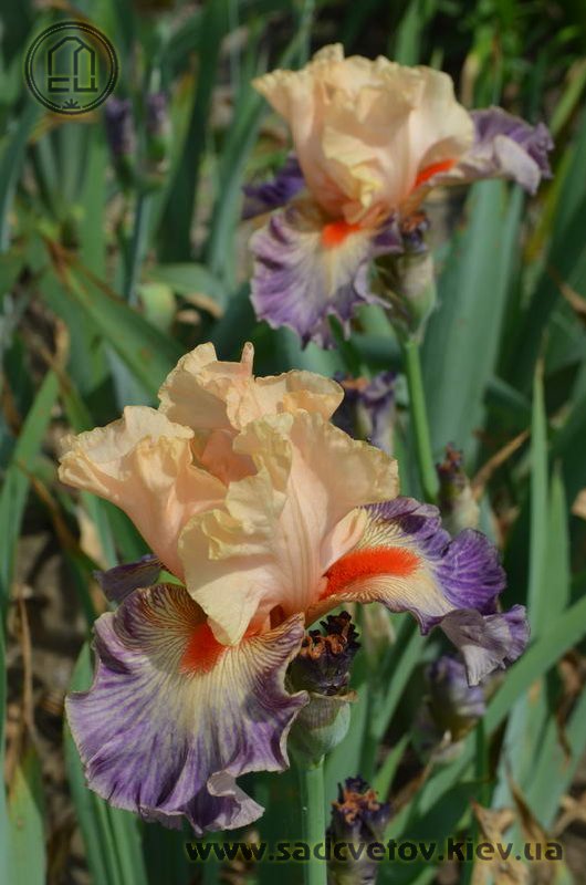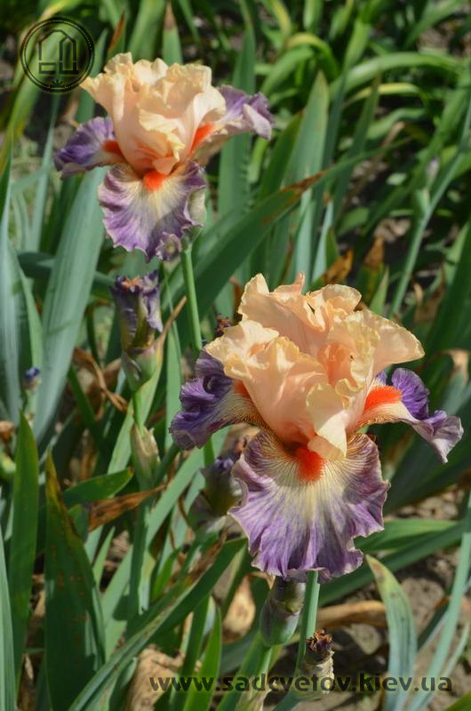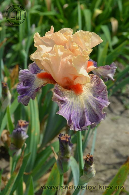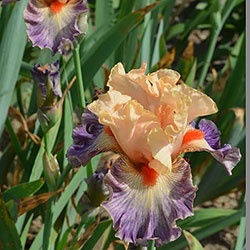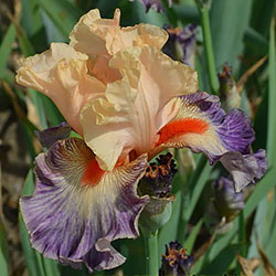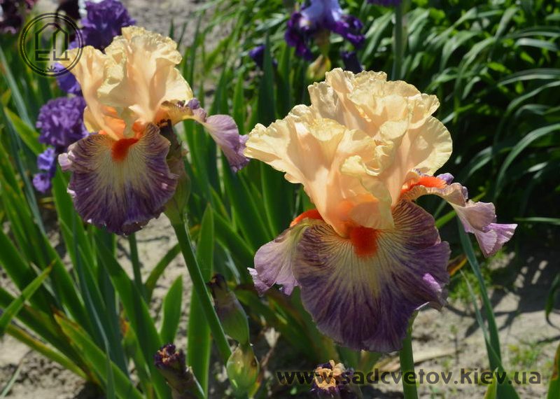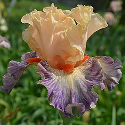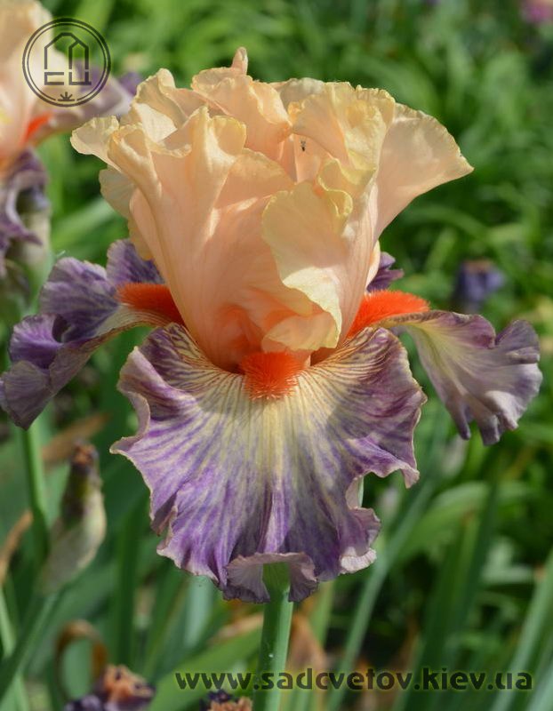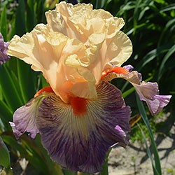 Яскрава гофрована квітка. Ст. - світлі абрикосово-рожеві. Ф. - люміната світло-абрикосових прожилок по лавандовій основі навколо дуже яскравої насиченого червоно-мандаринового кольору бороди.