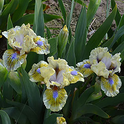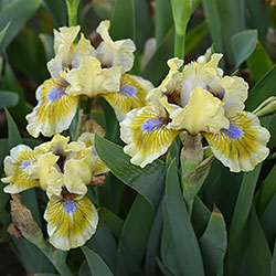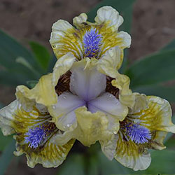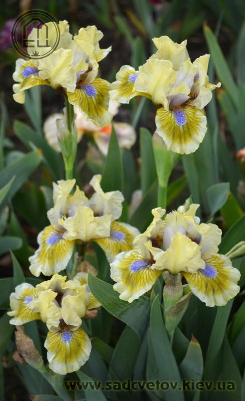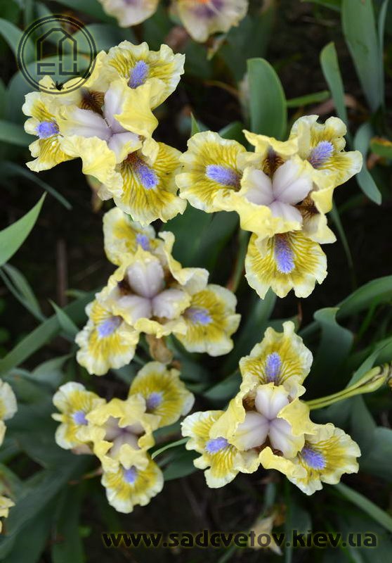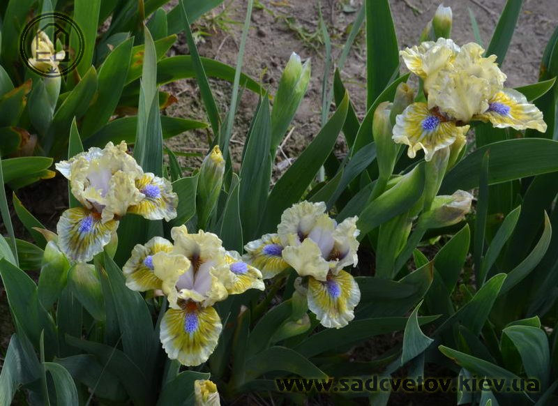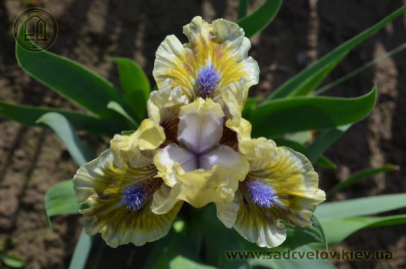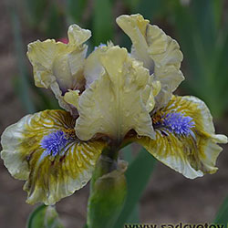 Гофрована квітка. Ст. - світлі перлинні зелено-жовті. Серединка як стандарти з лавандовим відтінком в основі. Ф. - Насичений гірчичний з широкою перловою облямівкою і таким же смугастим візерунком з боків від бороди і в плечах, коричневі бризки під бородою. Б. - волошково-сині з мандариново-гірчичним в горловині.