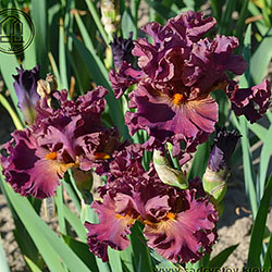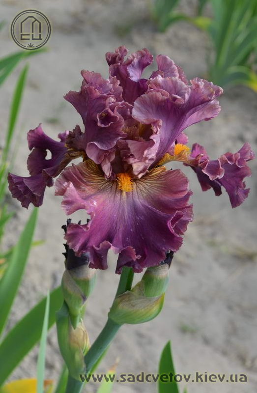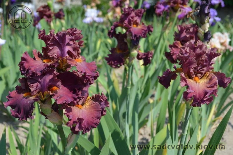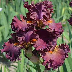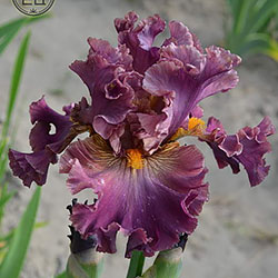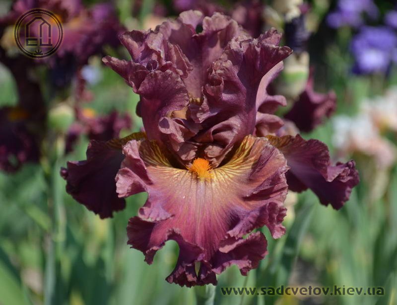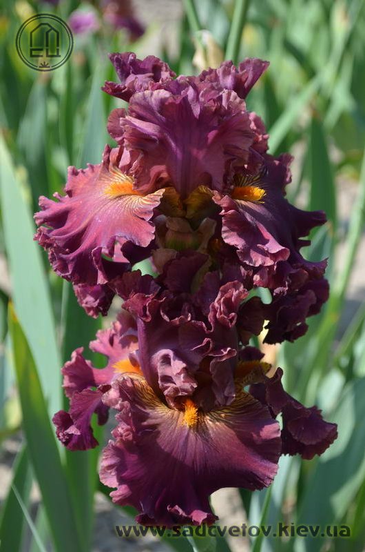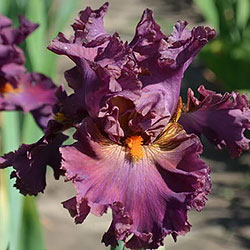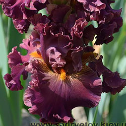 Дуже гофрована однотонна пурпурно-червона квітка з оранжево-жовтими б., люмінатою світлих прожилок навколо і червоно-помаранчевими плечима.