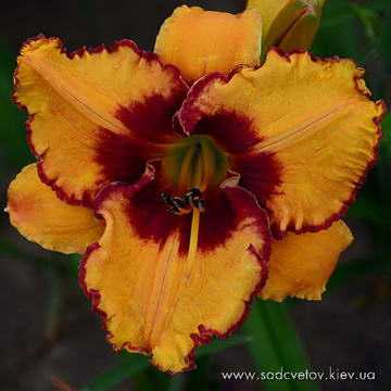 Гофрований темний червоно-коричневий з темним вишневим оком навколо оранжево-лимонного горла. Світлі смуги посередині через всю пелюстку.
