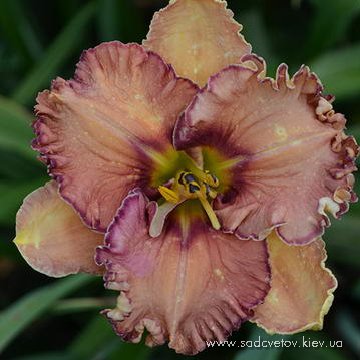 Рожево-абрикосовий з рожевими гофрованими краями і з пурпурно-коричневим оком навколо жовтого горла з промінчиками уздовж пелюсток в районі ока.