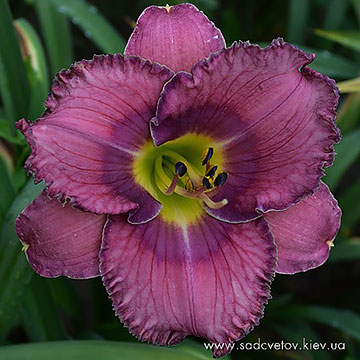 Гофрований пурпурно-малиновий з великим темним сливово-бордовим оком і такою ж гофрованою каймою з тонкою світлою ниткою по краю, жовто-лимонне горло .