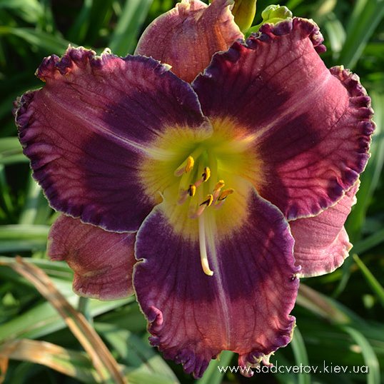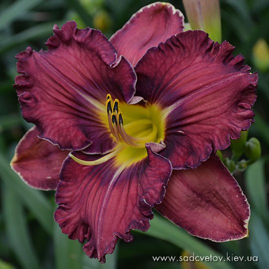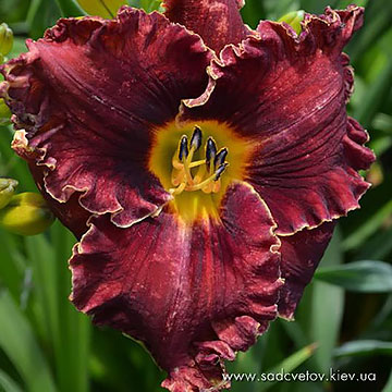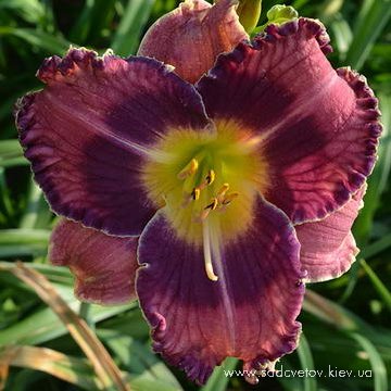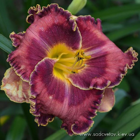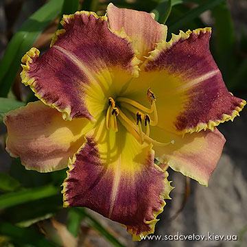 Гофрований пурпурно-малиновий з великим темним сливово-бордовим оком і такою ж гофрованою каймою з тонкою світлою ниткою по краю, жовто-лимонне горло .