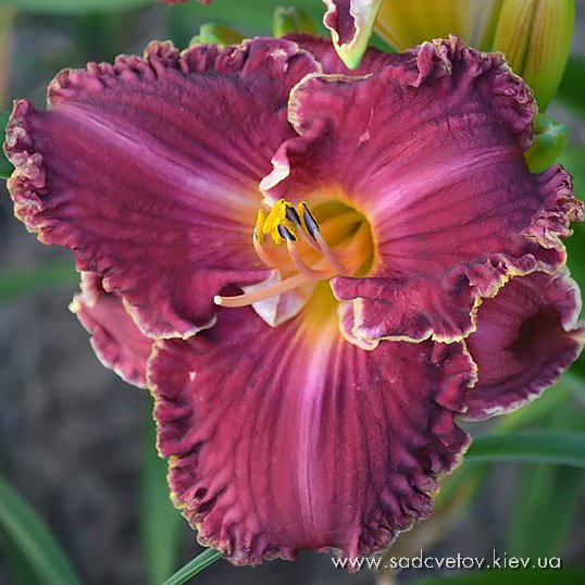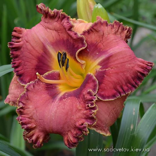 Прекрасно гофрований червоно-пурпурний зі світлим рожевим оком і жовто-зеленим горлом.