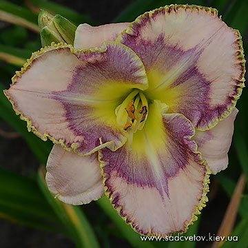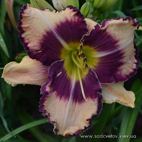 Великий гофрований світлий кремовий з великим сливовим оком і такою ж облямівкою, жовто-зелене горло.