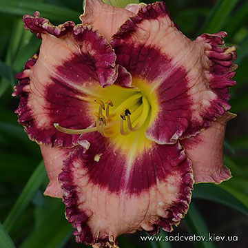 Гофрований світлий абрикосово-рожевий з яскравим насиченим карміново-червоним великим оком і такою ж широкою облямівкою по краю, лимонне горло.