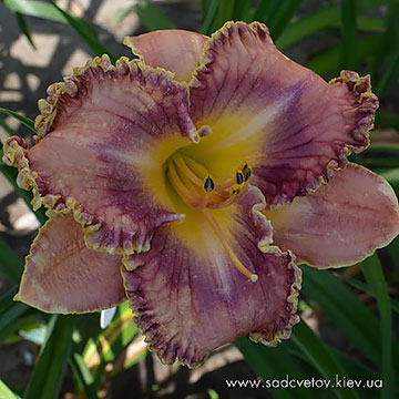 Елегантний гофрований рожево-ліловий з великим темно-малиновим оком, такою же за кольором облямівкою окресленою тонкою світло-золотистою облямівкою по краю, жовто-золотисте горло.