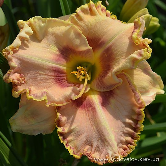Гофрований абрикосовий з насиченим червоно-пурпуровим оком і такою ж виразною облямівкою в поєднанні з рожевими зовнішніми частками оцвітини. Жовто-зелене горло.