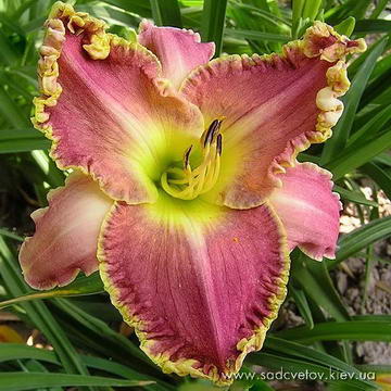 Супергофрований лілово-малиновий з легким блакитним оком навколо лимонно-зеленого горла, біло-жовта тонка облямівка по гофрованому краю.