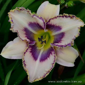 Акуратна гофрована контрастна біло-кремова квітка з темним вишневим оком розсіченим світлими променями з лимонного горла і широкою каймою кольору ока.