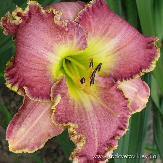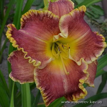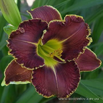 Гофрований темно-пурпурний з вишневим оком і лимонно-зеленим горлом.