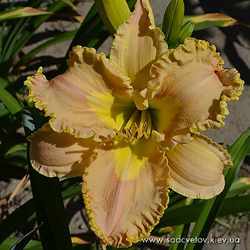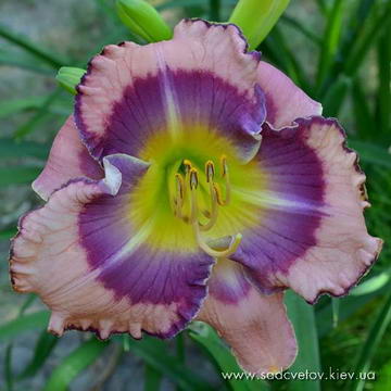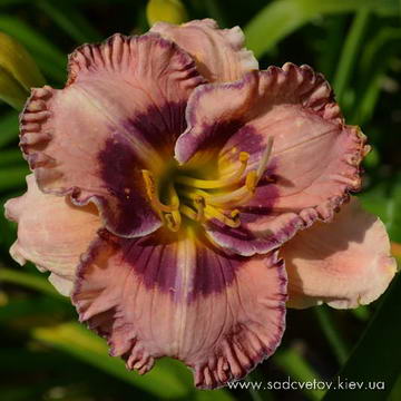 Прекрасно гофрований світлий кремово-рожевий з круглими пелюстками круглим сливово-пурпуровим оком навколо оранжево-лимонного горла і тонкою пурпуровою облямівкою крізь всі гофри пелюстки.