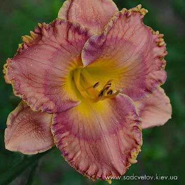 Гофрований коралово-рожевий з фіолетовим оком окресленим малиновим і жовто-лимонним горлом, з жовто-лимонною гофрованою облямівкою.