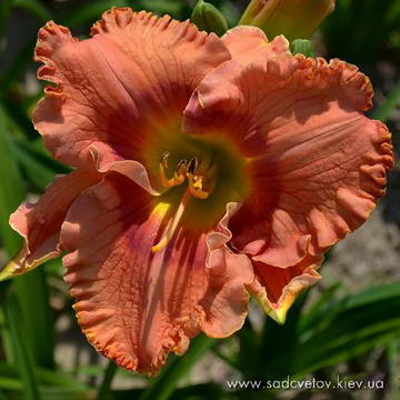 Великий супергофрований коралово-лососєвий з більш темним червоно-малиновим оком такою ж тонкою ниточкою по краю, горло-зелено-жовте.