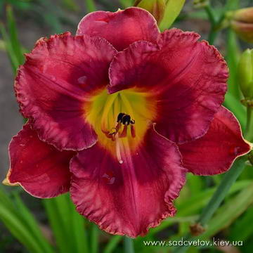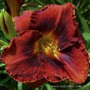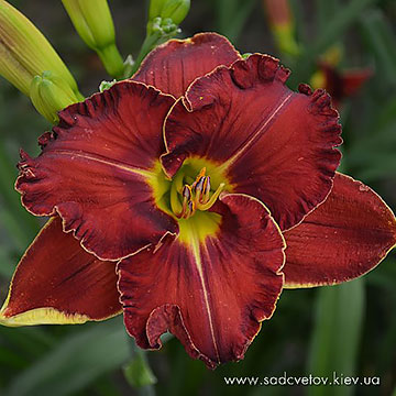 Прекрасно гофрований великий темно-червоний з золотисто-білою тонкою облямівкою по гофрованому краю і з великим пастельно-червоним оком навколо жовтого горла із зеленою серединкою.