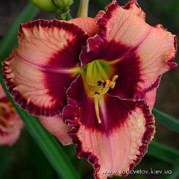 Світло-рожевий з великим лілово-лавандовим оком окресленим в розтяжку бордовою облямівкою і такою ж облямівкою по гофрованому краю пелюсток, зелено-жовте горло.