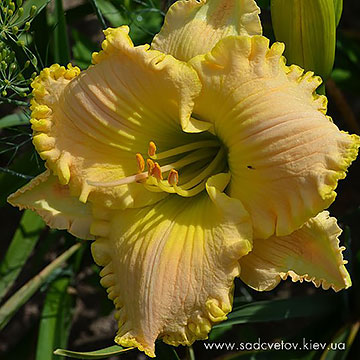 Гофрований кремово-білий із світло-лавандовим оком навколо великого аплікативного лимонного горла і тонкою облямівкою, що поєднує кольори ока та горла.
