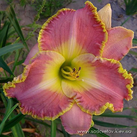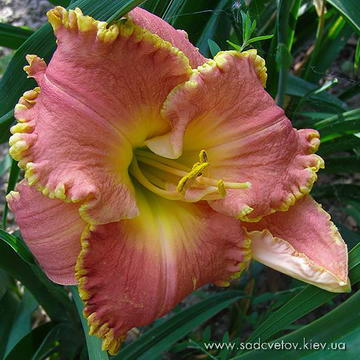 Рожевий з фіолетово-малиновим оком і облямівкою по гофрованому з золотистими мереживами краю, лимонно-зелене горло.