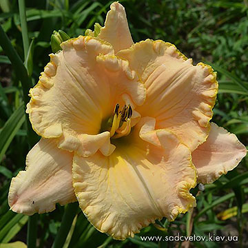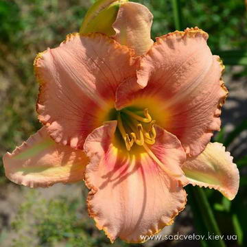 Гофрований, великий широкопелюстковий абрикосовий з цегляним оком і такою же тонкою каймою по гофрованому краю, друга жовта облямівка. Жовто-помаранчеве горло.