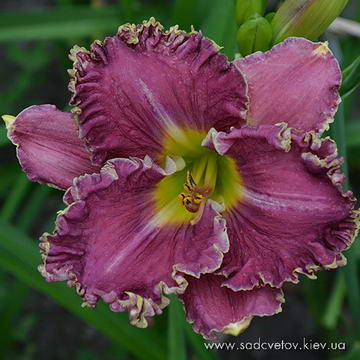 Добре гофрований темно-малиновий з великим темним сливово-ліловим оком навколо лимонного горла і такою ж широкою облямівкою по краю, світлий золотистий торець пелюсток.