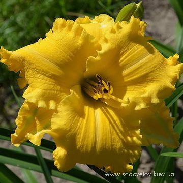 Гофрований контрастний за кольором яскравий лимонний з темним вишневим оком і облямівкою, лимонно-зелене горло.