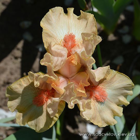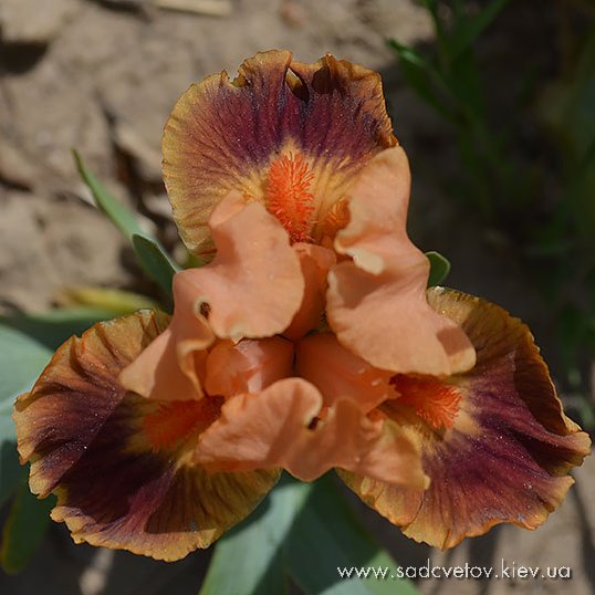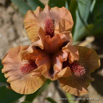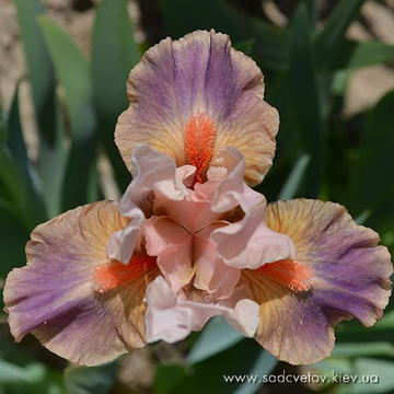 Гофрована квітка. Ст. - помірний оранжевий, серединка - помірний жовтувато-рожевий з світло-оранжевими кінчиками, ф. - колір стандартів в основі з візерунком темних гірчичних прожилок з боків борідки, лавандове сяйво під б. з кінчиками помірного оранжевого по основі помірного пурпурного.