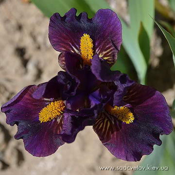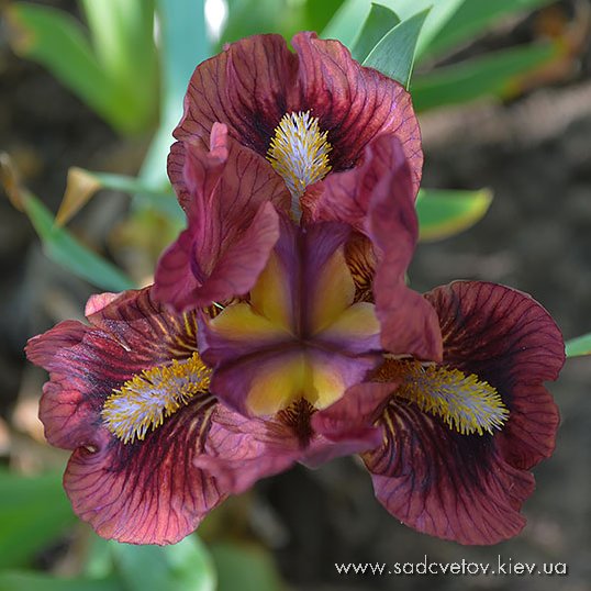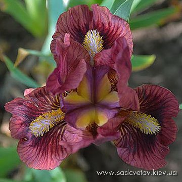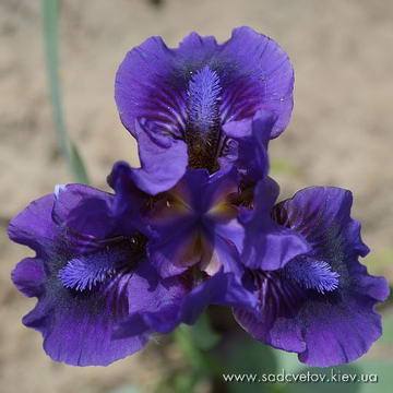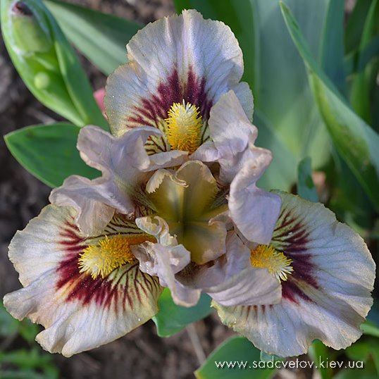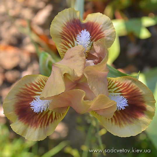 Квітка кольору світлої деревини, ст.-світло-коричневі, на ф. червоно-коричнева пляма навколо небесно-блакитних б. яке виділяє облямівку кольору стандартів
