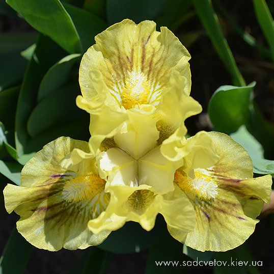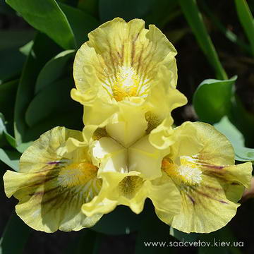 Однотонна добре гофрована квітка з круглими горизонтальними фолами. Лимонні ст., ф. - в основі колір стандартів з гірчичним візерунком прожилок окресленим 1/5" облямівкою навколо яскравої лимонної з білим на кінці б.