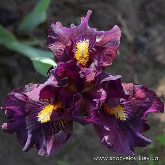 Темно-фіолетова гофрована квітка з золотистими включеннями в серединці, ф. з вишневими боками і смугастим візерунком білих, жовтих і фіолетових прожилок біля жовтої з білою основою б.