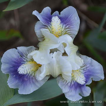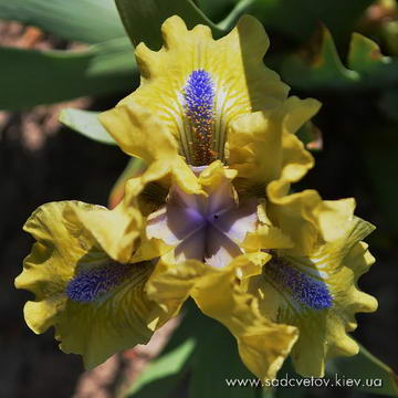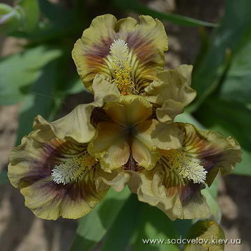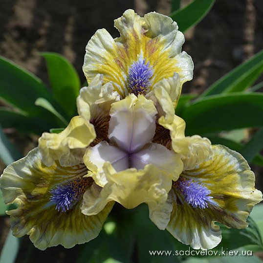 Гофрована квітка. Ст. - світлі перлинні зелено-жовті. Серединка як стандарти з лавандовим відтінком в основі. Ф. - Насичений гірчичний з широкою перловою облямівкою і таким же смугастим візерунком з боків від бороди і в плечах, коричневі бризки під бородою. Б. - волошково-сині з мандариново-гірчичним в горловині.