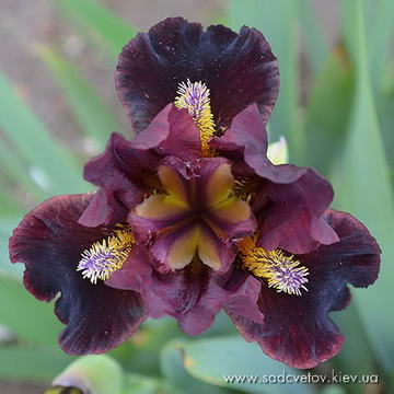 Ст. вишневі, ф. - оксамитові темно-вишневі з висвітленням до країв до рожево-червоного, б. - насичені лимонні кінчики по біло-лавандовій основі.