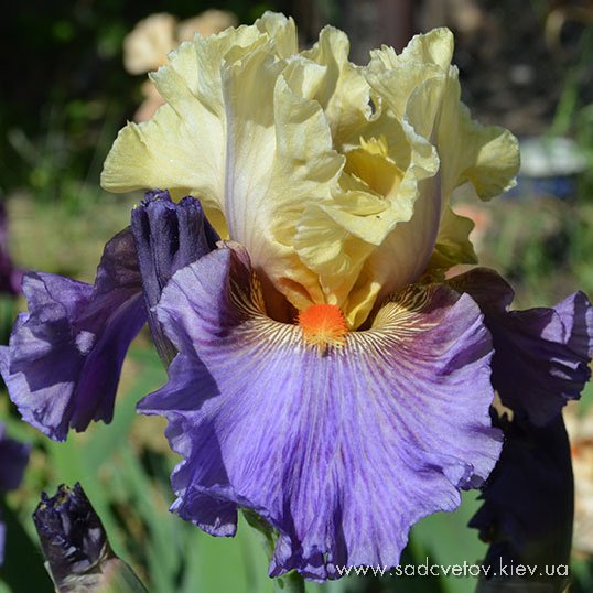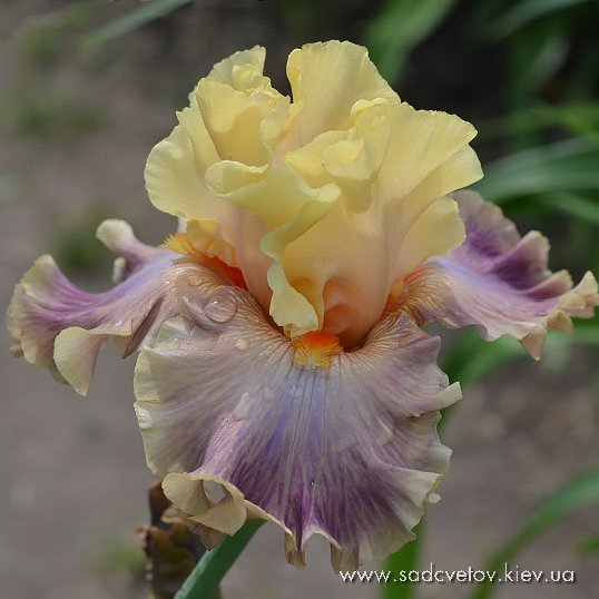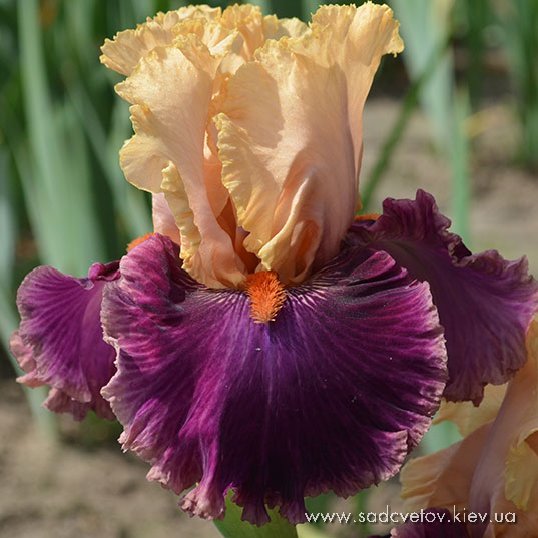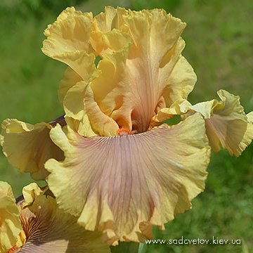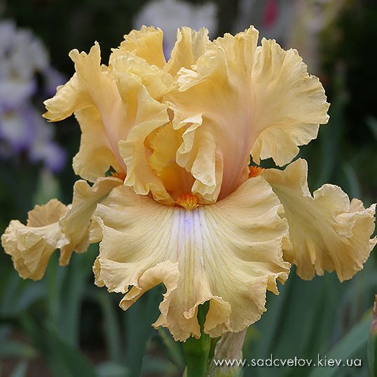 Супергофрований. Перехід від абрикосового до кольору манго зі світло-блакитним туманним "полум'ям" в центрі ф .. Бороди помаранчеві. Чудова форма.