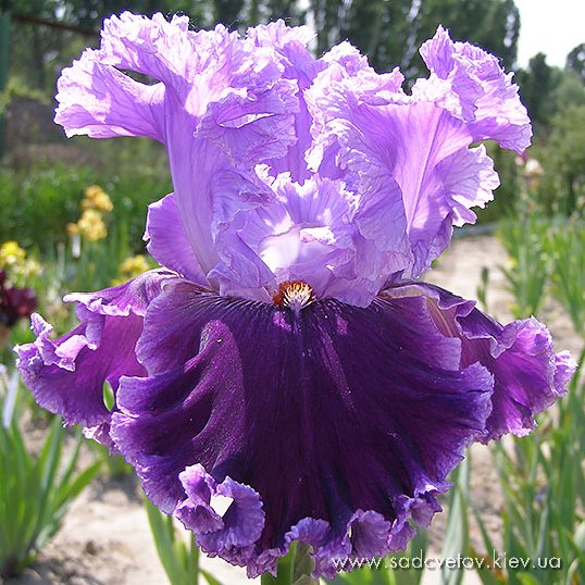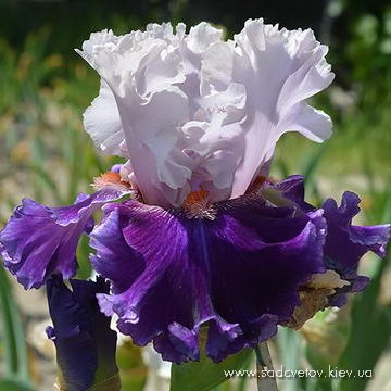Гофрована двотонна квітка. Ст. - блідо-бузкові з лавандовим стрижнем в середніх жилках. Ф. - темно-фіолетові, висвітлені під бородою і по краю, смугастий візерунок білих прожилок з боків помірно лососєвої бороди з висвітленим рожевим кінцем.