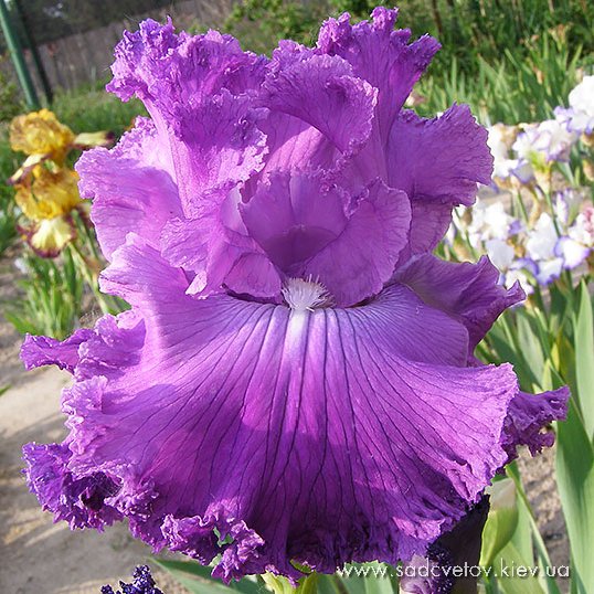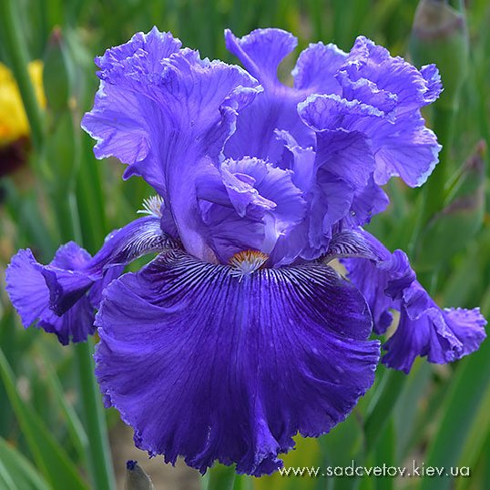 Добре гофрована квітка. Ст. - білі із золотистою облямівкою по краю. Ф. - насичені темно-ультрамаринові з виразним узором білих прожилок з боків від оранжевої б. і 1/6" світлою пурпурно-блакитною облямівкою по краю.